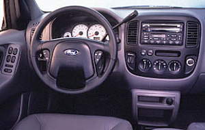 ![]() ▲如同Escape全新風格的外觀,其內裝的設計也是採取與其他FORD SUV車款截然不同作法。在產品競爭力上,Escape之所以優於對手RAV4與CR-V之處莫過於其較完整的動力選擇,除了基本版車款上與對手同級的2.0升Zetec系列直列四缸引擎外,車廠也提供了另外一具3.0升的Duratec系列V-6引擎供車主選配。其中2.0升直四採用DOHC 16V的配置,最大馬力130hp/5400rpm,最大扭力18.7kgm/4500rpm,至於3.0升的V-6同樣也是採DOHC每缸四氣門的設計,最大馬力200hp/5750rpm,最大扭力27.7kgm/4000rpm。雖然油耗向來不是購買SUV車種的買主非常在意的考量之一,但是Escape平均10.5km/L的油耗數字仍然能夠將FORD SUV車系的總體成績提昇不少。在變速箱方面,FORD同時提供了五速手排與四速自排兩種選項讓Escape的買主選擇。然而與以往的其他款SUV兄弟相較,Escape在驅動系統的設計上可說是截然不同,迄今為止整個FORD的SUV/卡車家族皆是以後輪驅動底盤為基礎,但是Escape卻是一輛以前輪驅動底盤為基礎的新車。當然,除了基本的前驅車款外,FORD也開發了一套全新的四輪驅動系統搭載在Escape之上,這套基本上運作方式是介於『全時』(Full-Time)與『適時』(On-Demand)四驅之間的系統與同級車所使用的適時系統最大的不同在於其內配置有中央差速機構,當加力箱切換至『4×4 Auto』模式時,Escape在一般的狀態之下是以前驅方式行駛,但是在前輪有打滑現象時會自動將扭力逐漸傳遞到後輪之上,這是適時系統的作用部份。然而這套系統也同時具有一般適時四驅所沒有的4×4鎖定模式,中差上的螺旋線圈電磁閥會將前後車軸間的耦合機構鎖上,而成為前後車軸恆定50/50扭力分配的模式。Escape的加力箱並沒有低速檔模式,FORD表示這是因為差速器的耦合鎖定能力以能應付大部份的輕度越野需求。
