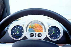 ![]() ▲在儀表板上可以見到多種叫lash;能的顯示幕,除了導航地圖外,還可見到越野車專用的傾斜角度儀及磁性羅盤。為了配合Dune這輛車的明亮風格,VW選擇了稱為『旭日黃』(Sunrise Yellow)的豔黃色作為Dune的配色主調,雖然車內配設基本上是保持了New Beetle原本就風格獨具的設計,但是也在一些細節上做了更符合越野車硬派作風的修改點綴。然而,整個車室之內最引人注目的特點,莫過於Dune非常先進的多叫lash;能行駛輔助系統。在方向盤前方的三個圓形表面中,正中央的大圓表上可以見到一個整合衛星導航地圖,磁性羅盤,車身前後、左右傾斜角的顯示面板,類似的設備通常都只能在非常純種的越野車輛上見到,可見Dune的越野特性並不是單純的虛有其表而以。雖然車廠方面並沒有表示Dune有沒有量產的可能,但其以New Beetle為基礎的機械結構與內外觀設計事實上與路上的街車並沒有太大的差異,或連lash;真的有一天VW會考慮將其付諸實行,作為New Beetle的一種衍生車款來銷售也說不定。