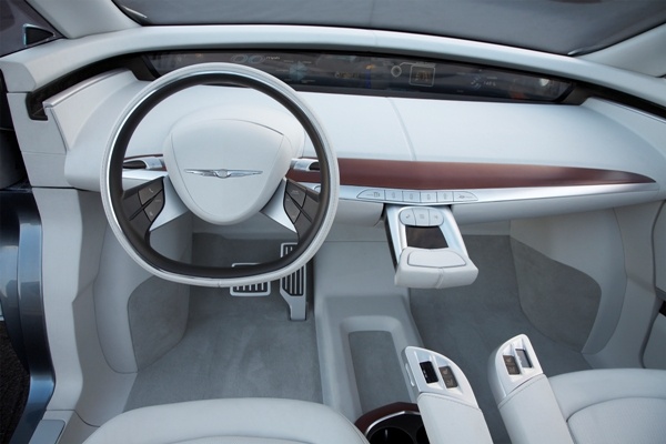 ![]() Chrysler ecoVoyager的中控台突破傳統的設限,皮質包覆的寬廣大V弧線的控制台及前擋玻璃下方整面的顯示儀表,不但展現科技感,更是簡單明瞭易使用。儀表板位於方向盤的上方,減少駕駛人視線的移動。中控台是一個可隱藏式的平台,引用電腦使用的概念由按鍵及輸入感應台組成,取代了傳統的多按鈕中控台的配置。