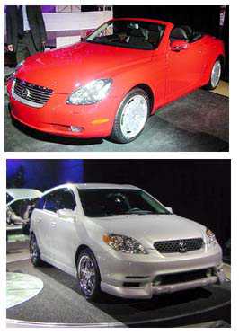 今年底特律中另一個龐大勢力,就是TOYOTA和LEXUS的攤位,佔據了整個會場相當的面積,不新lash;為全球第四大車廠的風範。而LEXUS記者會是排在媒體日的第二天下午,算是極具關鍵的黃金時段,上千人媒體圍繞在舞臺旁邊,期待今年的新作出現。開場就是悠揚的弦樂三重奏揭開序幕,突然大放光彩隱藏後面的搖滾樂團躍出,以激昂瘋狂音樂將氣氛炒作到最高點,以態勢和用心評析算是極具誠意的參展廠商。首先就是眾人期盼的LEXUS SC430出現,在經過一年時間後該車已經以量產形式現身,擁有LEXUS豪華品牌為後盾,自動收納硬頂與雙門設計,市場族群就是多金的時髦新貴,價錢全配備車款為六萬一千美金,預定上市時間就在今年中第三季。同時推出的為LEXUS新一代對抗雙B小型車主力款IS,在動力提昇到3.0升後,現在為它裝上了可由方向盤控制升降檔的五速變速箱,讓該車營造更佳駕駛樂趣。而為了迎戰雙B全系列小型車;尤其剛推出的M-BENZ C系列Wagon,IS也同步推出五門掀背旅行車,使車系陣容更為齊全。