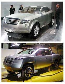 還記得去年底法國RENAULT接管NISSAN後,展開了一連串動作平衡該場財務狀況,甚至一些消費者臆測日產這家廠是否已經元氣已盡,不過在兩千年各大車展NISSAN一項都沒缺席的前提下,似乎證明大家是多慮了!而在其重要根據地的北美車展,NISSAN向來不放過機會大肆宣傳,尤其在北美市場中NISSAN製造的卡車、休旅車系向有不錯的口碑,這次主秀部份,有兩部概念車和一部量產車,其中一款概念版大型Pick-up,這輛車設計概念目標鎖定北美卡車市場,其級距相當於TOYOTA的Tundra、 Chevy Siliverados和北美最暢銷的FORD F-150車系。過去中小型NISSAN卡車都有不弱口碑,這次宣誓該輛概念車會在2003年進駐大型卡車市場,老美流行一句話:「擁有卡車便擁有美國。」,有鑑於此,力圖重整世界汽車版圖的NISSAN,確實對北美市場野心勃勃。