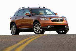 經過第二代概念車款的演進(FX45 II在去年的北美車展上便曾展出過),FX45終於準備要以2004年式的身份登陸美國市場了。這一部結合旅行車與SUV特色的新車種在外形上頗似NISSAN另一款剛推出的休旅車Murano之縮小版,而FX較為不同的地方則是擁有自己的細長頭燈(氙氣放電式)造形與INFINITI家族大型水箱護罩,尾燈組設計與之前的概念版本略有小差異,在車頂部分增加了行李架也是原來所沒有的。至於概念車時所使用的21吋鋁圈在正式量產上市後則改為20吋,好在落差不大,車迷們應該還可以接受。