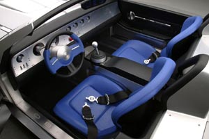 ![]() 內裝部分,Cobra concept使用藍色塗裝碳纖維座椅和鋁質中控台,架構起新世紀跑車慣有的科技感,當然其中也有不少設計借自FORD GT,座艙寬敞度佳可輕易容納兩位成人而不會感到壓迫感。由於屬新技術產品,為了減少阻力,Cobra concept棄用後視鏡,將車內鏡設計成三個顯示幕的視頻監視系統。有關於實際量產計畫,福特總裁Bill Ford表示,將仔細觀察在本次車展中各界反應,若一切順利不排除量產可能。一般認為,以福特近年來策略運作,量產應該已經排入決議階段,現在剩下的只是一張時間表。