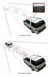 ![]() ▲上為車道偏離警告系統,下為碰撞抑制系統示意圖碰撞抑制系統則可通過攝影鏡頭和雷達,偵測來自前方障礙物、其他車輛位置、速度及方向來評估發生衝撞的可能性。當系統判斷有發生衝撞的危險時,便會向駕駛者發出警告,並加大煞車系統的制動力。並根據車速自動調整煞車力道,讓車速降低至5mph(8km/h)以下,以減輕衝撞時的衝擊力道。該系統仍同樣也還是處於開發中的階段,希望未來能夠達到無論前方與對向車輛是什狀況以及各種天候條件下都能正常運作。MERCURY將會在2007年推出SUV市售新車款,這部Meta One概念車身上的幾項先進安全技術與設計基因也將會移植至這些未來的SUV與Monterey廂形休旅車、Montego四門房車等新車之上。