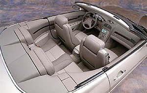 ![]() ▲採四座配置的車內裝置了大量高科技的配備,但卻以復古典雅的方式裝飾。300 Hemi C是一輛標準的四座敞篷車,在敞篷車上最被關切的莫過於意外時的撞擊防護安全,尤其是翻滾時的防護。因此,概念車款上配置有一個類似MERCEDES SL車款上的防滾桿,就隱藏在後座頭枕的後方,在感應到車輛有翻滾的危險時會自動彈出以取代敞篷車所欠缺的C柱結構,保護乘客的安全。除此之外,車廠也在考慮設計一種獨特的車門鎖鉤結構,加強車體在撞擊時的剛性表現。而身為一輛豪華概念車,一些高科技的未來配備自然不能遺漏,300 Hemi C的中控台上配備有稱為『Infotronic』的多叫lash;能道路資訊系統,利用GPS接收器與位在行李廂中的筆記型電腦,配合液晶顯示幕與語音控制系統,提供即時的導航、交通與氣象資訊,更令人意外的是車上還配有指紋辨識系統,只有經過認可註冊的人才能駕駛車輛。