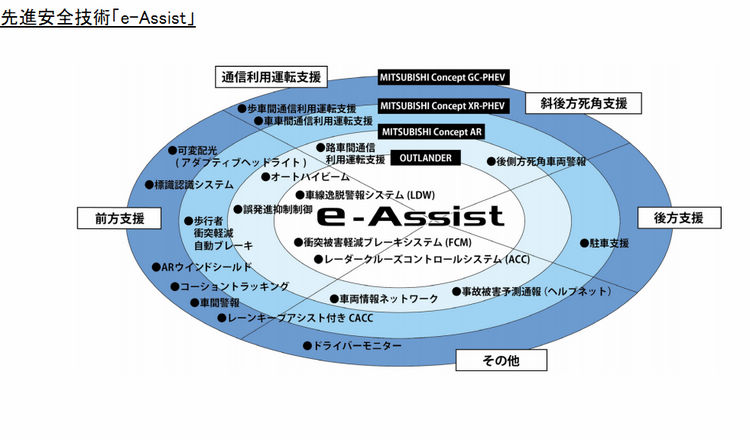 ![]() MITSUBISHI這次將透過三款概念車展示它們最新的“e-Assist”主動安全科技與先進聯網技術,這也是新世代MITSUBISHI量產車將會看見的新科技。這項科技包括多項危險預警的功能,像是後側死角車輛警示、FCM前方預警碰撞自動煞車系統、ACC主動巡航系統、LDW車道偏離系統、疲勞駕駛偵測、交叉路口來車預警煞車...等功能。