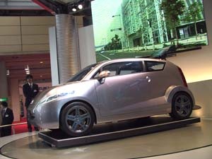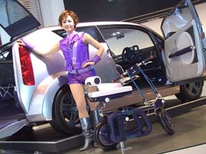 在展覽會場中的這兩部內藏機車的概念車,其中一部全透明的Unibox在先前的文章介紹過了,只不過Unibox實在是太勁爆了,活像活動檳榔攤,是一部離實用化非常遙遠的“真”概念車,真的量產大概也是兩岸統一後的事了。倒是另一部小巧可愛,同樣內藏兩部電動小機車的「Bulldog」,比較有量產化的可能。