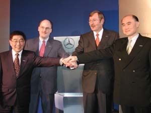 ![]() ▲台灣戴姆勒克萊斯勒的四位高階主管。右起為副總裁/朋馳汽車營運長 孫仲維先生,總裁/執行長 韓福客﹙Volker Harms﹚先生,副總裁/克萊斯勒&JEEP營運長 曾文吉﹙James M. Zemke﹚先生,財務暨行政副總裁 顧國華先生。台灣戴姆勒克萊斯勒股份有限公司將整合MERCEDES-BENZ、CHRYSLER、JEEP和SMART四個品牌在台灣的營運。台灣戴姆勒克萊斯勒分公司目前計畫各個品牌將各自發展經銷服務體系,但是在後勤管理方面則可以資源共享。因此像新車整備中心,財務系統,行政管理等就可以合併以發揮最大之經濟效益。而原來經營的兩個品牌管理團隊及員工,也是台灣戴姆勒克萊斯勒的重要資產,再結合戴姆勒克萊斯勒跨國企業的全球資源,使得這個新公司一開始就有相當好的競爭基礎。