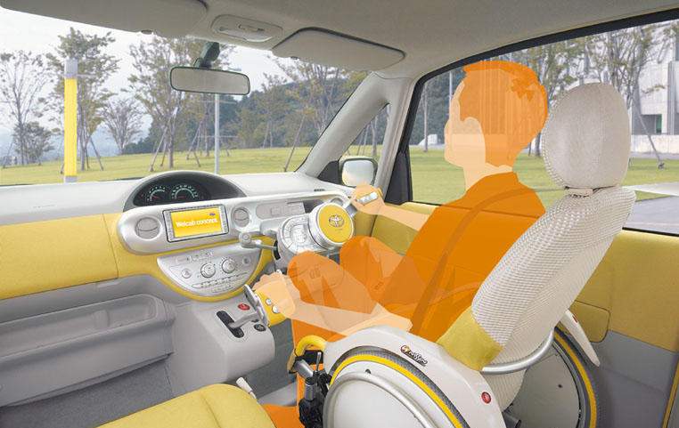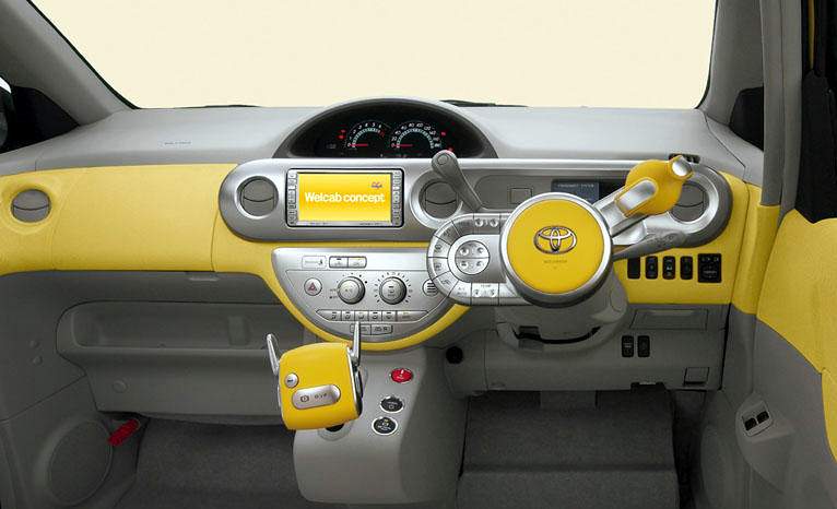 Welcab concept的駕駛座,其實就是一張專用的「駕駛座輪椅」,所以當殘障者想要用車時,就直接坐著這具輪椅到車子旁邊,在利用電動升降機將輪椅升到車室的高度即可進入,而副手座則是座椅與底座可以拆卸分離的設計,同樣也是利用電動升降機來進出。此外,油門、煞車與方向盤等操作系統都採用電子線傳控制方式來減少操作的負擔,各類的按鈕開關也改為集中配置的設計,讓殘障者能輕鬆地享受駕駛之樂。