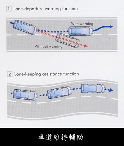 透過方向盤控制輔助與車頭的攝影機幫助駕駛者將車輛維持於所行駛的車道上,其中一種模式為當車輛即將偏離車道時,發出警告並自動略微修正方向盤角度,另一種模式則是持續修正方向盤角度讓車輛維持行駛於車道中央