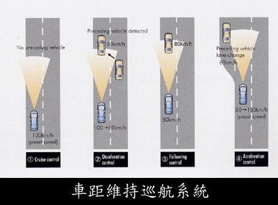 透過數種不同的感應器偵測目前所在車道以及與前方車輛之間的距離,將本身車速調降並維持一定車距,當前車離開(變換車道)後則會恢復至原先設定的速度