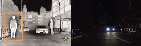 HONDA智慧型夜視系統![]() 以遠紅外線攝影機偵測前方路況並將影像傳至車內,如果偵測到車子行進方向前方有行人或正在穿越馬路中,系統就會發出警告音並在螢幕中將行人用方框表示來提醒駕駛者注意