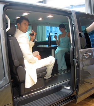 本次車展福斯商旅發表T5 GP系列的Mulitvan、Multivan長軸版及Caravelle。另外,還有一部可以讓民眾大開眼界的巨星褓姆車—Crafter 高頂長軸車款,這部車的來頭不小,是今年金馬獎及剛舉辦的亞太影展的主持人指定用車,車內還有主持人的簽名以見證這部車上路為巨星們提供頂級豪華的交通服務。它運用Crafter獨有的空間優勢安排了七張豪華座椅,第三排的三人座椅還可以完全平躺,這對於行程緊湊或拍戲無法充分休息的演藝人員來說就像飯店中柔軟的床鋪,可以提供絕佳的休息環境