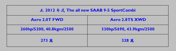 ![]() SAAB 9-5 SportCombi呈現出SAAB一直以來在掀背車領域上獨道的設計理念,絕美、令人讚嘆的外觀與聰慧的空間運用機能性,奠基於飛機製造傳承的優異血統上,讓這部豪華五門運動轎旅更顯與眾不同的非凡品味,此次來台進行亞洲首演,勢必為車展帶來絢爛光彩、並滿足全台SAAB粉絲的熱烈期盼。總代理商富公司表示:The all new SAAB 9-5 SportCombi預計最快2012年第二季中引進,車型將為2.0T Aero FWD及2.8T Aero XWD二種車型,售價分別為: