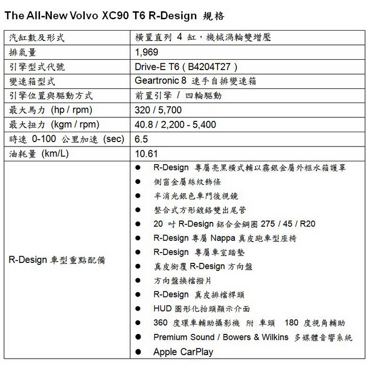 國際富豪汽車為了讓車迷朋友們感受品牌旗艦休旅另一標竿之作,將於台北車展正式發表 The All-New Volvo XC90 R-Design 運動化車型,除了亮眼吸睛的外型之外,動力配置則搭載獲選「2016 十大最佳引擎」肯定的全新 Drive-E T6 機械渦輪雙增壓引擎,擁有最大馬力 320 hp 與最大扭力 40.8 kgm 的充沛動力水準。
