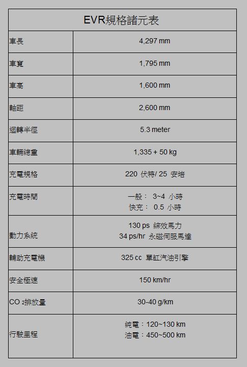 EVR增程式電動車可充電行駛也可透過持續加油無限行駛里程,較〈純電動車〉節省再次充電時間使行駛里程更長,較傳統HYBRID車款與內燃機引擎車款更經濟省油與低污染,也比現今的純電動車更具實用便利性,車價成本也將更為合理。EVR可以說是一部具備準量產身分的概念車款。