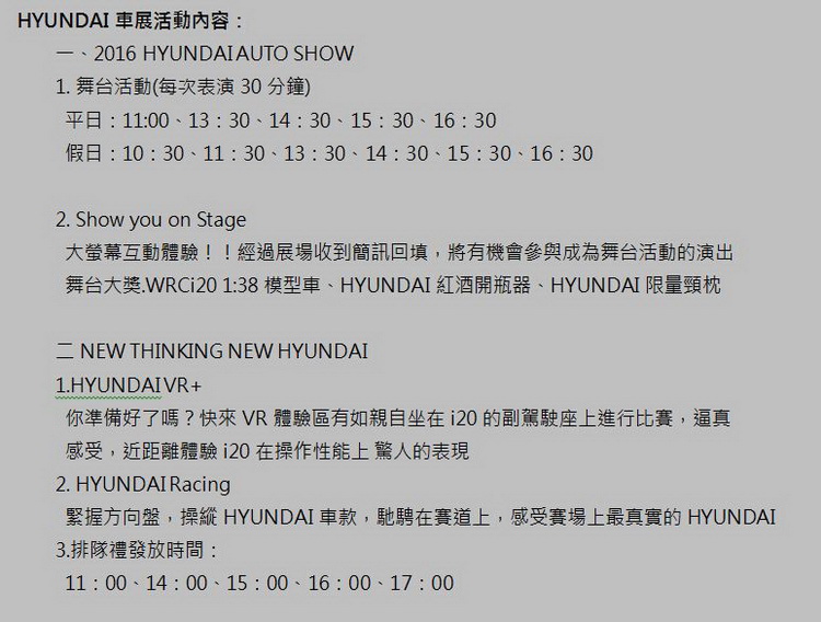 「N」品牌是HYUNDAI 集團傾注設計工藝優勢以及國際賽事致勝的性能研發經驗,所新成立的性能部門,代表HYUNDAI 挑戰頂尖性能領域的企圖心,也是開啟全品牌車款邁向熱血性能、更有駕馭樂趣的新指標。 在本次車展,HYUNDAI 率先引進WRC 2014 年首場德國站冠軍的i20 WRC 車款,要讓民眾近距離體驗「i20 WRC」車款的魅力;WRC 賽事被喻為所有賽車比賽中最嚴苛的戰役,賽道皆是各地最險峻、崎嶇的道路,參賽車輛更是要以市售量產車進行改裝而成,不只挑戰駕駛的技術,更是對造車工藝的極致考驗。 HYUNDAI 持續在WRC 賽事中獲得佳績,要向世人驕傲展現品牌即將發展的性能領域,除了i20 WRC實車展示外,在現場更有「N」品牌系列精品、賽車模擬器以及賽道虛擬體驗VR+,採用德國WRC賽事上的實景畫面,擁有360度全景視角,體驗超震撼的臨場感,提供民眾感受世界級的拉力錦標賽。