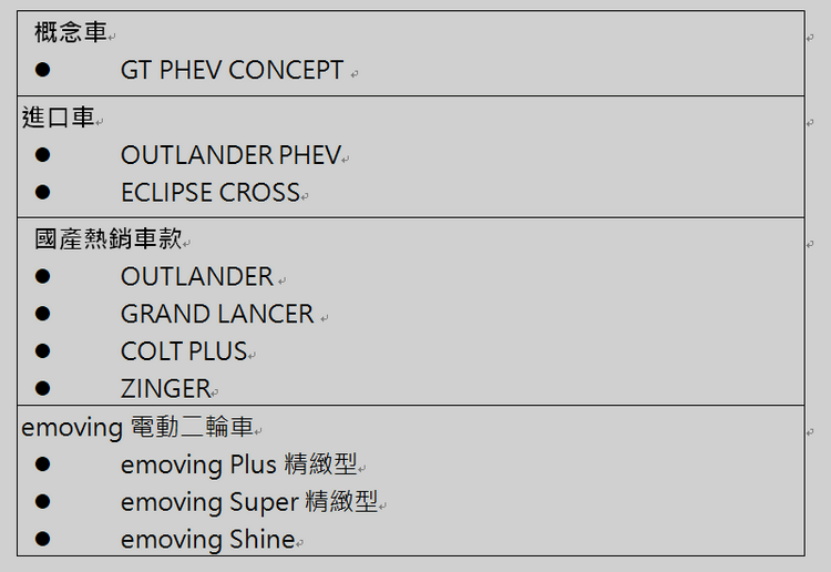 本次台北新車大展特別展出三菱汽車最新一代SUV概念車-GT PHEV,充滿未來設計感並兼顧環保節能的最新汽車研發科技;而現場同步展出的全球首發、即將導入國內的小型SUV-ECLIPSE CROSS加上現行市售的OUTLANDER PHEV、OUTLANDER、LANCER、COLT PLUS、ZINGER與emoving電動二輪車,也將帶給消費者充滿驚喜與豐富的賞車體驗。