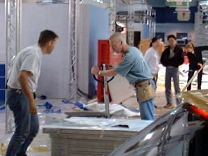 ![]() ▲有什麼機會能夠讓世界各款名車一次泡進你的眼簾呢?有!就是這一次的台北新車展在小編下午剛進入會場時,便發現各大車廠都正加緊趕工搭建展示區的硬體架構部份,並且陸陸續續的讓參展的車輛從場外運至會場內。其中BMW攤位的車子最為神秘,因為或連lash;是車輛都以打好蠟的關係吧,所有BMW的參展車均以藍布罩起來,讓身為車展先鋒的小編頗為失望。不過話說回來,連lash;多其他廠的名車卻也以毫不保留的呈現在小編的眼前,像是HONDA的主力強打—S2000跑車,就終於讓小編看到了它的廬山真面目,其他像MAZDA的敞蓬小跑車MX-5、MS-X、PORSCHE的超級跑車Boxster S等等,也都盡收小編的眼底。同時也讓人對於正到式展出時,所有披著神秘面紗的參展車款將羅衫盡解,光彩炫目地在大家面前呈現的光景感到相當期待。