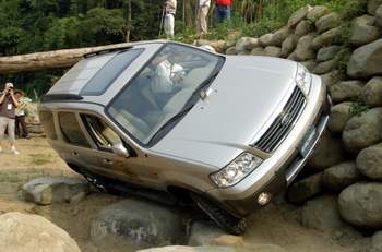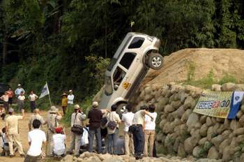 此關主要是模擬遭遇道路坍方的情況時該如何脫困,因此路基將縮減至不到車寬的一半寬度,為了要繼續前進,駕駛人將要利用坡度接近垂直的山壁作為「道路」以繼續前進。在過程中,由於車輛車身將大幅傾斜至40∼45度之間,因此車輛將處於極端扭曲的狀態之下,所以更能藉此考驗整體車身剛性的強弱。以FORD旗下的Explorer與Escape為例,即使中途停車開啟車門,五個車門依然完全開關自如,足證FORD SUV之車身剛性的傑出之處。 由巨大的石塊所堆砌而成的本關乃是考驗車輛低轉速扭力極限的一關,駕駛人必須完全聽從副駕駛的引導,一步步地克服高達約一公尺、角度近60度的巨大石塊。這關除了考驗駕駛人的技術之外,也考驗副駕駛對於路線選擇的判斷能力,除此之外,對於車輛驅動系統動力的分配與懸吊壓縮行程的長短也有著極大的考驗。