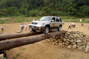 此一關卡由大小不一的鵝卵石所構成,這種路況對於一般低底盤的轎車來說實乃一大夢靨,而對於一般SUV而言,也是考驗4X4系統動力分配能力良窳的最佳考驗。對FORD SUV 來說,只要穩定地油門控制並選擇正確路徑,在四驅系統優異的前後軸動力分配之下,使得駕駛人得以輕鬆過關。