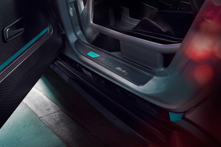 進入座艙,首先映入眼簾的是 Kimi Antonelli親筆簽名的門檻飾板。內裝以霧面碳纖維鋪陳,座椅、車門與中央鞍座皆點綴 PETRONAS 綠色細節。方向盤由CUBE CONTROLS全新設計並優化操作邏輯,中央鞍座嵌有專屬 「1 of 30」限量徽飾突顯稀有收藏價值。