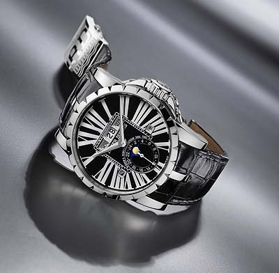 ![]() ROGER DUBUIS的「Excalibur萬年曆月相GMT兩地時間」錶款,藉由經典的圓形錶殼,與面盤中央白色方形軌道時標做為整個設計的核心,展現ROGER DUBUIS膾炙人口、熱情奔放的設計概念;沿著方形軌道時標的內圈,ROGER DUBUIS忠實的呈現了萬年曆、GMT兩地時間、月相盈虧的報時功能,軌道時標外側則鑲嵌了閏年裝置、日/夜指示功能,加上時針、分針,共有超過九種的功能視窗與指針,在ROGER DUBUIS錶廠工藝師巧手的精緻排列下,配戴者可輕鬆讀取所想知道的時間。