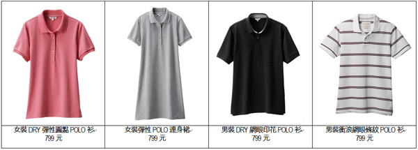 UNIQLO POLO衫針對不同需求,添以不同機能元素,讓POLO衫不再侷限於休閒風格,更能滿足多樣場合穿著需求。男裝網眼POLO衫以復古洗色搭配鬆軟網眼編織,復刻水洗散發出瀟灑不羈的型男魅力;DRY網眼POLO衫以繽紛色彩搶功之外,更有快乾的實用機能,讓夏日清爽宜人不再黏膩;此外,設計款POLO衫使用舒適的DRY材質外,襯衫領讓POLO衫更端莊,即是洽公也不失莊重。女裝則使用彈性布料,貼身但不緊身的剪裁展現女性特有的曲線,除了短版窄身設計之外,女裝也推出連身裙系列,簡單穿出女性柔美的休閒運動風。