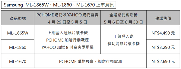 全球消費性電子產品領導品牌台灣三星電子,針對學生、一般家庭用戶、SOHO族推出三款全新系列黑白雷射印表機:ML-1670、ML-1860及Wi-Fi無線印表機 ML-1865W。三款最新印表機承襲三星印表機優雅外型的血統,迷人細緻優雅的流線設計,流暢簡潔的外型設計以及輕巧節省空間,讓印表機不再只是單調的IT產品,更能為辦公室、住家增添設計美感,更是品味的最佳象徵。 除了簡約優雅的外觀設計,三款新機型皆內建三星獨家的”隨觸印”及”Anyweb”功能,只要透過隨觸印按鍵one touch便能輕鬆輸出螢幕上瀏覽的網路頁面,讓您的列印工作更加順暢便利,看到什麼就印什麼。