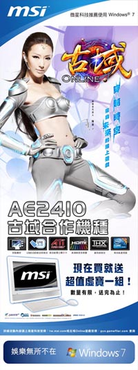 全球All-in-One PC領導品牌 - MSI微星科技,率先採用全新Intel Sandy Bridge平台的觸控一體成型電腦:Wind Top AE2410將於6/1在台上市,同時也是線上遊戲廠商_遊戲新幹線_古域online指定合作機種。首賣期間(6/1~7/30),只要買AE2410,就送超值虛寶卡一組,數量有限,送完為止。