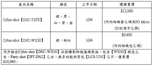 Cyber-shot兩款數位相機【TX55】與【WX30】,將於10月4日上市。歡迎消費者前往Sony台北(101)直營店、Sony台北(復興)直營店、Sony台中直營店、Sony高雄直營店、Sony官方購物網站【www.sonystyle.com.tw】、Sony客服中心(電話:4499111)以及各大消費性電子產品通路選購。