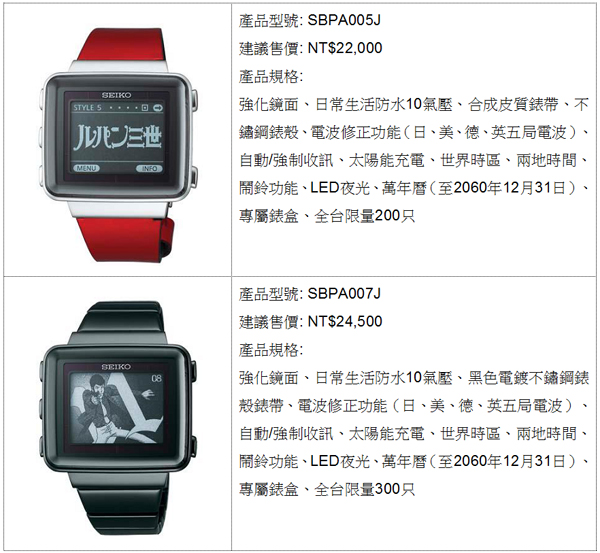 ![]() ▲錶款型號: 左圖SBPA005J ; 右圖SBPA007J限量發行的『俠盜魯邦三世』EPD太陽能電波電子錶,搭載由SEIKO獨家應用的EPD( Electrophoretic Display )電泳顯示技術,高達300dpi的超清晰解析度,呈現完美高畫質,讓詼諧的動漫人物栩栩如生、活靈活現地在手腕間做變化;五種時間顯示模式,配戴者能依自己的喜好與心情做變換;環保太陽能機芯,日常配戴即可自動充電,滿電狀態可連續使用6個月不需再充電,啟動省電模式更可達到41個月不充電的低耗能狀態;具備電波自動校時功能,除能接收日、美、德、英五局電波外,會於每日凌晨2、4時自動電波校對時間,無時無刻掌握最準確的時間脈動;此外具備世界時區、兩地時間、萬年曆、鬧鈴等功能,相當具有實用價值。『俠盜魯邦三世』EPD太陽能電波電子錶有「正義紅」及「酷炫黑」兩種款式,全台限量分別為200與300只,即日起於SEIKO全省形象店首賣。