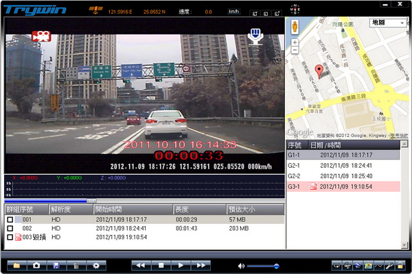 衛星導航機: ・全球首款行車記錄器結合衛星導航機 ・5吋高畫質(800x480)全平面觸控面板 ・採用聯發科MT3351高感度衛星接收晶片,具備快速又精準的定位。 ・內建FM無線發射器:(可透過汽車FM接收器傳送導航語音及記憶卡內的音樂檔,進行語音播放)。 ・影像輸入(AV-IN) ・內建4GB儲存空間,另可擴充Micro SD Card至32GB。 ・內建128MB記憶體 行車記錄器 ・G-Sensor碰撞感應自動鎖住檔案 在發生車禍時,因碰撞時有感而能夠自動鎖住當時影片,才不會造成舉證 困難。 ・錄影時自動記錄軌跡,與Google Map同步顯示,而內建Trywin Player 播放執行程式即可清楚觀看記錄器影片的實際路徑。