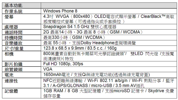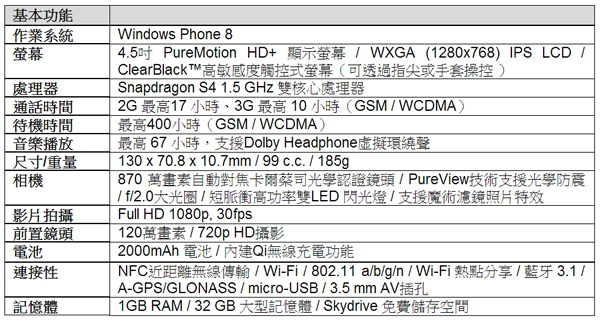 即日起至2012年12月10日止,Nokia Lumia 920、Nokia Lumia 820新機上市消費者預購活動,開放於諾基亞行動電話館、諾基亞行動體驗特約店預約購買,凡預購消費者,將可獲得由諾基亞所準備的限量優惠預購禮 : Nokia原廠無線充電板DT-900(限量1,000個,數量有限,送完為止 ; 贈品顏色隨機出貨,預購據點請參閱諾基亞官網之說明http://www.nokia.com/tw-zh/retail-stores/ )。 Nokia Lumia 920規格表