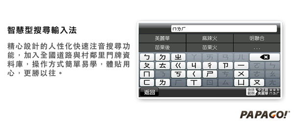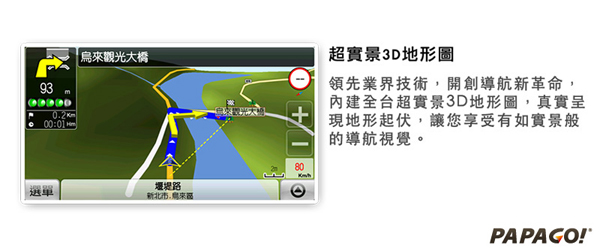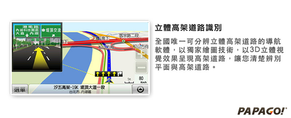 導航PAPAGO!除了支援iPhone5的解析度外,更費時半年開發全新繪圖引擎,重新調整Retina視網膜螢幕顯示,讓畫面更加細膩流暢。此外 , 一邊導航邊顯示即時門牌的功能, 一直深受許多運將朋友及業務同仁喜愛。本產品還採用3D DEM技術,為業界唯一內建全國地形圖導航軟體,配合高架道路立體呈現,更真實地顯示實際行車情況。