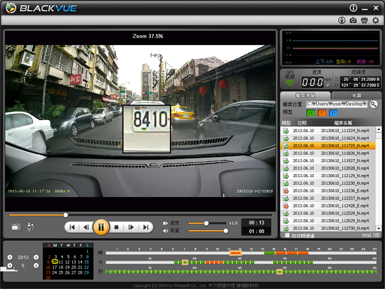 測試結果會說話![]() ▲BlackVue操作圖組DR500GW-HD搭配200萬像素的CMOS鏡頭,乍看之下好像像素不高,但是面對市售的行車紀錄器,它所能拍攝的解析度卻已達到1080pFullHD@30fps的程度,加上使用了H.264影音壓縮格式,不但讓畫面的清晰度大幅提升,同時也不會有跳格的問題。消費者購買行車紀錄器最看重的還是在各種光線下的清晰度,當然測時的時候一定不能錯過,以下就分別為大家呈現不同的光線下的成果。 ![]() ▲操控介面圖組![]() ▲即使在逆光的情況下也能拍到前車的車牌。![]() ▲在BLACKVUE畫面上點選左鍵,會出現放大鏡的功能,方便辨識車牌號碼。