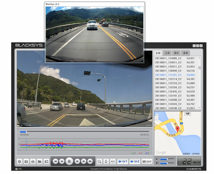 ▲內建軟體可以同時顯示雙畫面,右下角也有地圖資訊與車速,並有G值感應圖表。