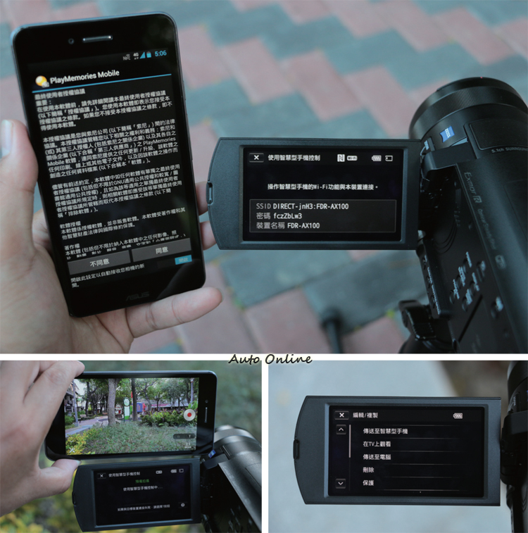 此外,FDR-AX100具備三段ND減光鏡,並可透過機身後方的切換鈕進行調整。而這次除了具備多項自主調整的選項之外,FDR-AX100還新加入了手機連結的功能,透過與PlayMemories Mobile APP的連結,即可使用基本的拍攝與傳輸功能,當然沿用多時的NFC也一定不會缺席,只不過在iPhone 6發表後,那項Android獨有的連結方式似乎也不再獨家了。
