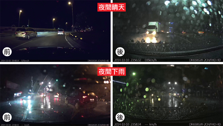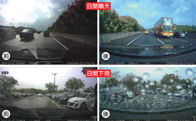 實際上路之後,DR650GW-2CH在日間的拍攝表現非常清晰,由於出發時北部正下著雨,筆者便連上WI-FI監看了雨天畫面,從手機的螢幕上顯示,前鏡頭的表現真的是沒話說,即便是下雨的狀態,依然可以清晰地拍到前車的車牌號碼,不過後鏡頭就稍微吃虧了些,因為沒有後雨刷,因此雨水大多停留在後擋玻璃上,導致干擾了後鏡頭的清晰度,不過還是能夠看出後方車輛的動態。隨著路程來到了台中,天氣也逐漸晴朗,這時候它的能力就完全展現出來了,前後鏡頭的表現都相當優異。