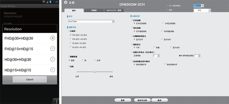▲採用前後雙鏡配置,在APP與電腦程式中可以選擇解析度的搭配,最高為前1080P@30fps;後720P@30fps的組合。