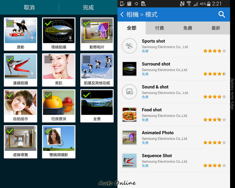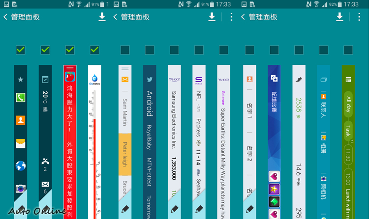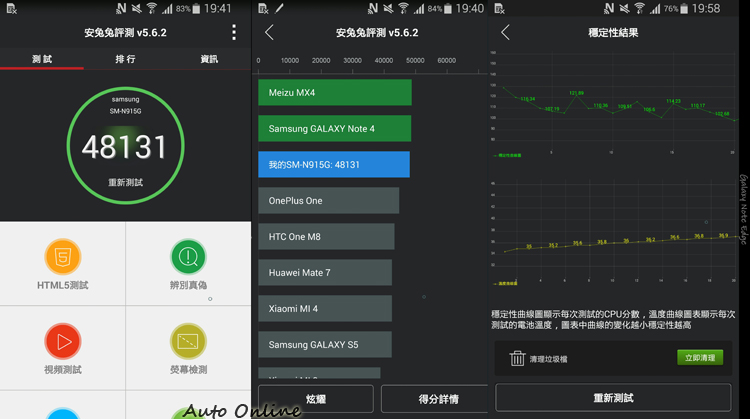 實測體驗![]() ▲安兔兔評測的結果,Note Edge獲得48131的分數,與同門兄弟Note 4可說是旗鼓相當,而在穩定度的表現也相當優異。其實講到Note Edge大家不免俗的會拿它的兄弟Note 4出來討論,而利用安兔兔評測程式跑分後,Note Edge的成績達到48131分,雖然筆者手中並沒有Note 4的成績,但從各家媒體的測試與安兔兔評測程式中的紀錄來看,雖然這兩款手機在CPU的配置上略有不同,但它們的實力確實是非常相近的。如果說Note 4算是SAMSUNG Galaxy家族中的機皇的一員,那我想把Note Edge列入其中也是當之無愧。 ![]() ▲對於男性使用者來說,Note Edge還算就手。![]() ▲Note Edge音量鍵的位置偏高,橫向使用時容易誤觸。![]() ▲Note系列最重要的配備就是S Pen。![]() ▲S Pen的功能相當多元,快捷的設定也非常便利。![]() ▲升級後的S Pen在書寫感受變得更加真實流暢。![]() ▲Note Edge的曲面螢幕具有非常多工具選擇,不過最多只能設定七組使用。![]() ▲曲面螢幕可以獨立喚醒使用。![]() ▲曲面螢幕可自由設定文字。![]() ▲曲面螢幕除了有許多功能可以應用外,拍照的控制鍵也都顯示在螢幕上。