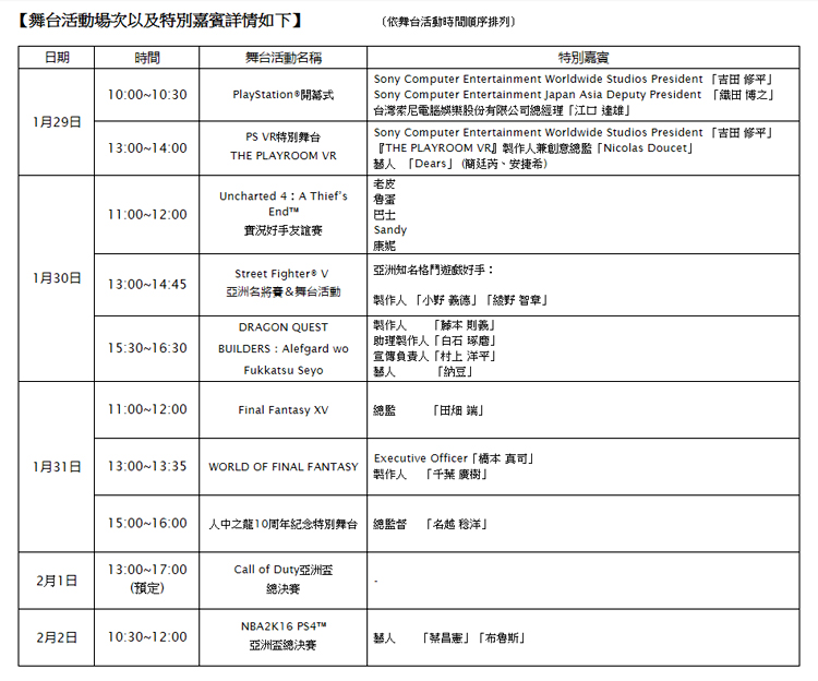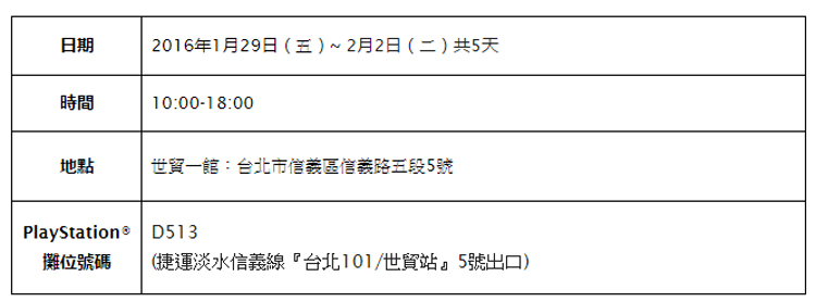 為期五天的2016台北國際電玩展即將於今年1月29日展開,Sony Computer Entertainment Taiwan(SCET) 本屆不但不缺席,今年在PlayStation攤位規模更勝以往,除了展出多達30款的遊戲供消費者試玩,在五天的展期中也會邀請海外知名遊戲製作人參與舞台活動,此外,今年也首次規劃尚未上市的PS4™虛擬實境(Virtual Reality)裝置PlayStation®VR(PS VR)體驗專區,將設置十多款遊戲、40個試玩機台,有興趣的民眾可別錯過本次展覽。