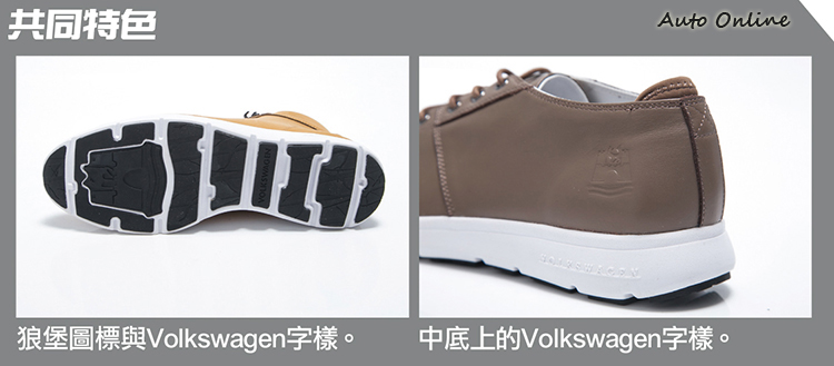 Volkswagen Wolfsburg是本次介紹所有鞋款中最具風格的一個系列,由於設計理念兼顧商務使用與休閒穿搭,因此鞋面選用牛皮材質以突顯它的質感,而為了擁有比商務鞋更舒適的穿著感受,除了使用Ortholite鞋墊外,在中底的部分也用上柔軟舒適的EVA材質,有效減少穿著商務鞋時的疲勞感。此系列橡膠鞋底的設計同樣頗具巧思,除了抓地力良好的紋路設計外,狼堡圖標與Volkswagen字樣也都設計於此。