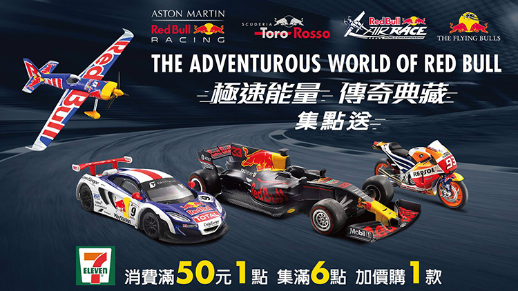 動力迷看過來~Red Bull這夏玩最滿! Red Bull攜手超商龍頭7-ELEVEN,於8/1 – 9/9 獨家推出多款合金模型集點活動,每50元消費即可獲得1點,加價購99元即可換得Red Bull多款模型;期間只要購買Red Bull 任2罐,另加贈1點,於9/11前還可以憑發票加入Line官方帳號@redbulltaiwan完成登錄,抽獎Aston Martin Red Bull Racing賽場體驗之旅。