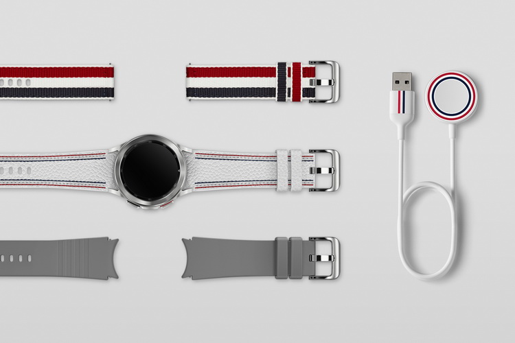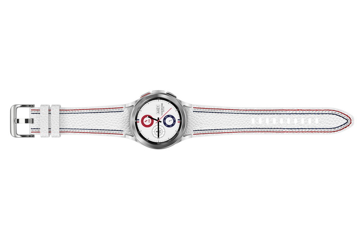 Galaxy Watch4 Classic Thom Browne限量版以精品級的鍍銠錶殼打造有型的時尚外觀。不僅外觀設計令人驚艷,手錶介面更融合Thom Browne經典紅、白、藍三色元素,精緻細膩的細節為用戶提升專屬尊寵感。隨附三款風格設計錶帶,可依不同的生活情境搭配組合:「混合皮革錶帶」將白色調作為基底,佐以紅、藍雙色條紋飾邊,展現都市貴族的低調奢華。