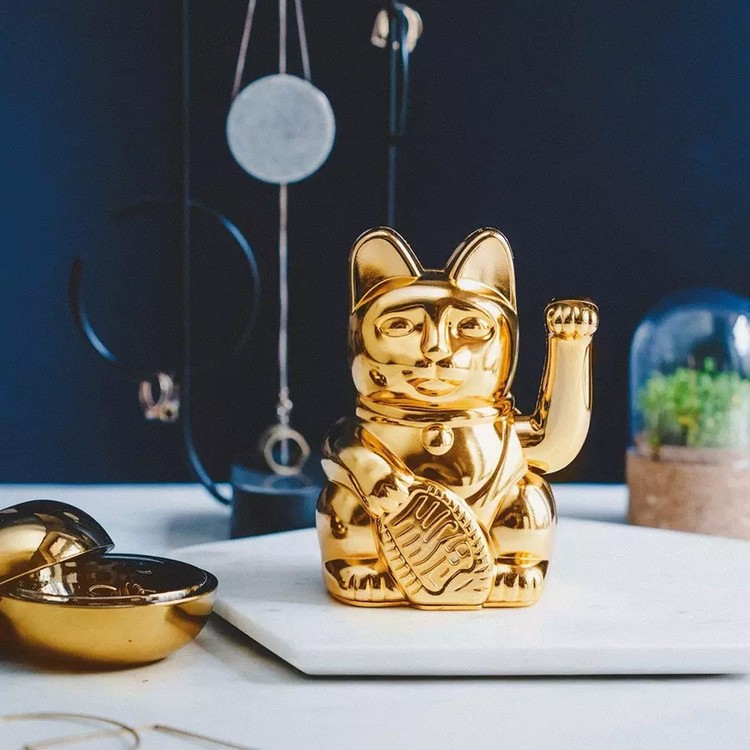 在日本舉左手的招財貓為雌性貓咪,代表廣結人緣、招來好運。而舉右手的被認為是雄性,代表招財進寶。限量金色款招財貓招來公平與正義,亮黑色款貓擺件可避邪消災!