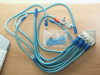 ▲整套GROUND WIRE線組包括螺絲、束帶通通都附在裡面,此線很粗,不用束帶固定肯定不會服服貼貼。 負極接地線就是疏通下游電路的秘方,所有接點都是低電阻、抗氧化的鍍金接頭,比照高級音響訊號線辦理!導線部分為軟銅材質編織成形,能承受大電流並抵抗拉扯、彎曲,雖然沒出現發燒音響等級的OFC長結晶銅,但沒有車主希望自己的愛車也「發燒」吧!所有的配縣市經過計算的,接點位置需要承受較高電流者必須加粗直徑,接頭接觸面積也要大才有整體效果。