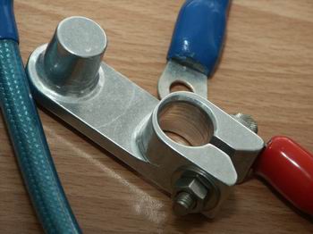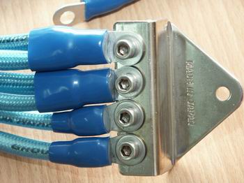 ▲線材為編織狀銅絲構成,強度高,接頭加工堅固牢靠,所以價格並不低廉,市售價在三千大洋以上。接頭部分為高強度金屬接和加工,經得起長時間拉扯不脫落,夾縫中並以矽膠填補空隙,外表以PVC絕緣材質披覆,可靠度高。在四合一接頭部分並非固定在電瓶的負極座,因為GROUND WIRE整組線材用料太高檔,「份量」可不輕,四合一接座固定在電瓶上可能導致接座撕裂。因此四合一接座必須固定在車身金屬部分如擋火牆、前工字樑等,固定處也可當作一個接點使用,接著將四合一接座與電瓶負極間之GROUND WIRE接地線接上即可。