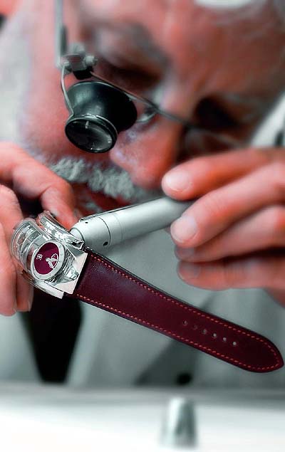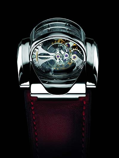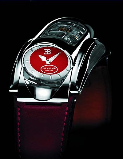 ![]() ▲沒有錶冠設計,上鍊及時間調整為類似汽車離合器結構但Bugatti Type 370大辣辣的將各機板分層配置,中間採用透明視窗可清楚透視機芯各部位結構及運轉狀況,從機板最下方的擺輪、縱擒結構到中央的儲能顯示及靠近面盤的發條動力結構都看得一清二楚。由於此乃腕錶中的創舉,因此許多結構、零件必須重新設計,包括機板拉開後,減速機構從同軸大小齒輪必須設計成分離式雙齒輪,中間以類似後輪驅動車中央傳動軸結構的傘形齒輪做銜接,汽車差速器結構的差動齒輪也應用在發條動力結構中。一般機械腕錶除了錶冠結構外,是相當罕見90度銜接的齒輪機構,此巧妙的機芯安排與汽車結構結合的特殊工藝,襯托出此超級跑車腕錶超級的價值,此錶在亞洲巡迴展示選擇台灣為首站,應該也是看中台灣人的購錶實力吧,原廠開出250萬的高價,由於是限量的關係,不準備個800萬台幣恐怕是無法將這「手腕上的引擎」帶回家。