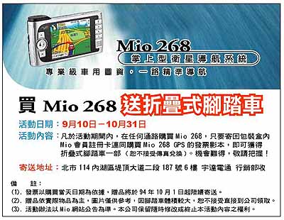 至於專為開車族設計的Mio268,則是購買就贈送市價4000元的折疊式腳踏車,對喜歡到處旅遊的Mio玩家來說,這項機動性高的贈品很實用,駕駛人開車到定點後,就能改搭腳踏車來趟「鐵馬之旅」,既健康又帶有探險的味道。而且折疊式腳踏車攜帶方便,可輕易收放在車後行李箱,絕對是玩家的旅行良伴。即日起到10月底為止購買Mio268,只要將包裝盒內的會員註冊回函卡及發票影本寄回,免抽獎就可以得到市價4000元的折疊式腳踏車,敬請把握機會。